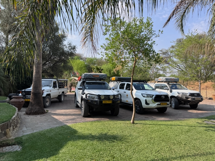 Da wir nicht genau wussten wie wir den ersten Tag nach Nachtflug, Klima-Anpassung und allgemeiner Aufregung so drauf sind, hatten wir uns ein Guesthouse in Okahandja ca. 80 km entfernt gemietet. Der Linksverkehr machte wenig Probleme: Ich bin gefahren und Christoph hat aus der Stadt raus navigiert. Sobald wir aus der Stadt raus waren, gab es eigentlich nur noch weiße Offroad-Jeeps mit Dachzelt, die sowohl in unsere, als auch aus der Gegenrichtung unterwegs waren.