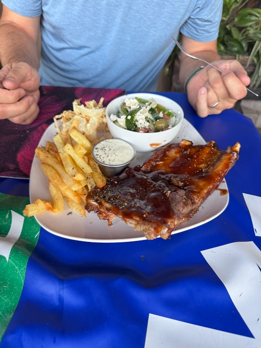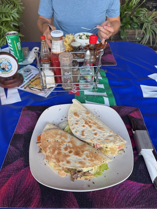 Spencer lassen wir auf dem Parkplatz stehen und gehen zu Fuß ein paar Meter durch den Ort, um im Rhino´s etwas zu essen. Christoph bestellt Ribs und ich Tacos.