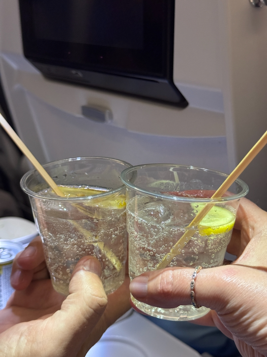Angestoßen wird traditionell mit einem Flugzeug-Saft. Lasst den Urlaub beginnen!