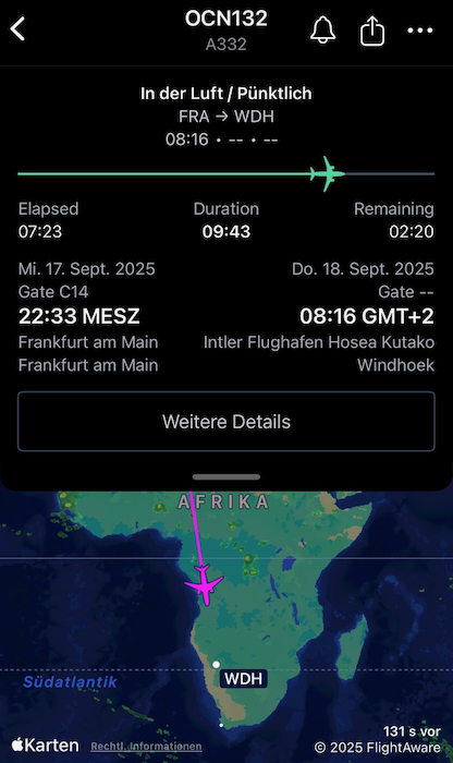 Wir legen nicht viel Wert auf Luxus, aber wir gönnen uns einen Direktflug Frankfurt-Windhoek (1.500,- p.P., Holzklasse). In den letzten Jahren hatten wir häufig Probleme mit Streiks kurz vor und direkt am Reisetag, sodass die Umsteigesituation immer stressig war. Von FRA aus sind wir noch nicht geflogen, Premiere! Und Abends sind wir auch noch nicht gestartet, das fühlt sich ungewohnt an.