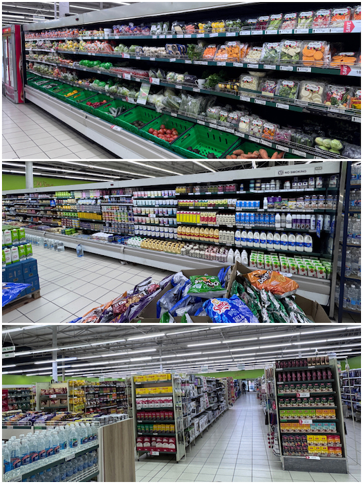 Zuerst gehen wir zum Supermarkt, um unsere Lebensmittelvorräte aufzufüllen.
