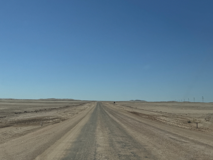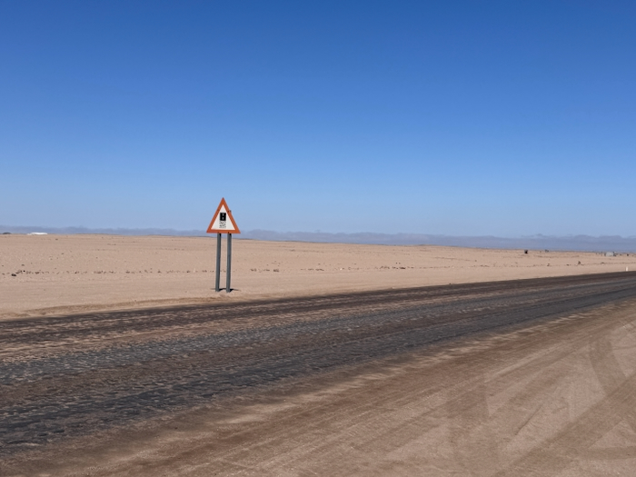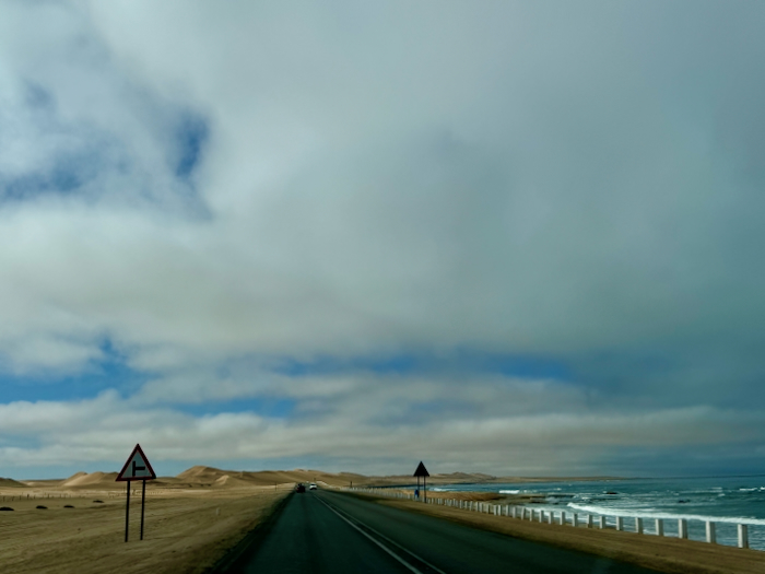 Wir cruisen das erste Stück des Weges zwischen Wüste und Meer entlang. Anhalten können wir hier leider nirgendwo.