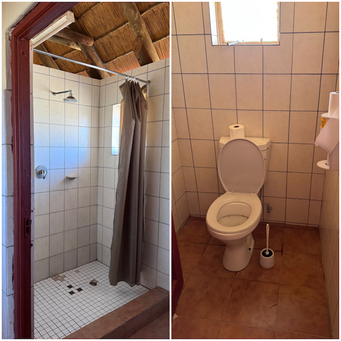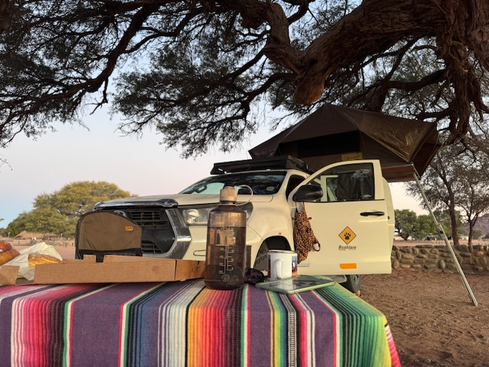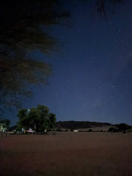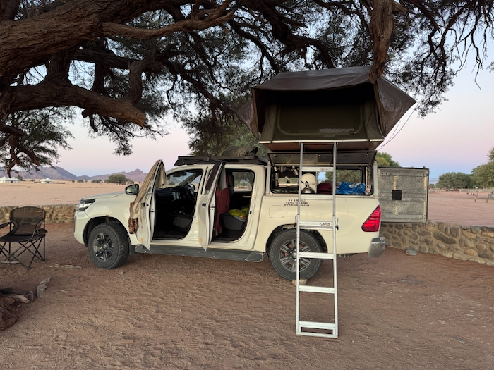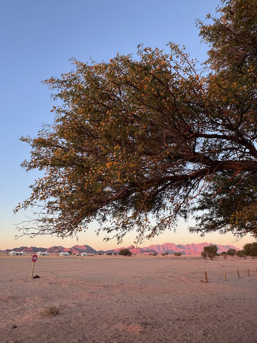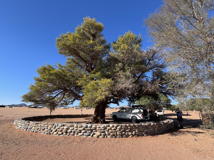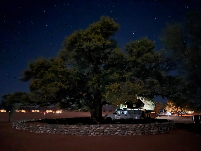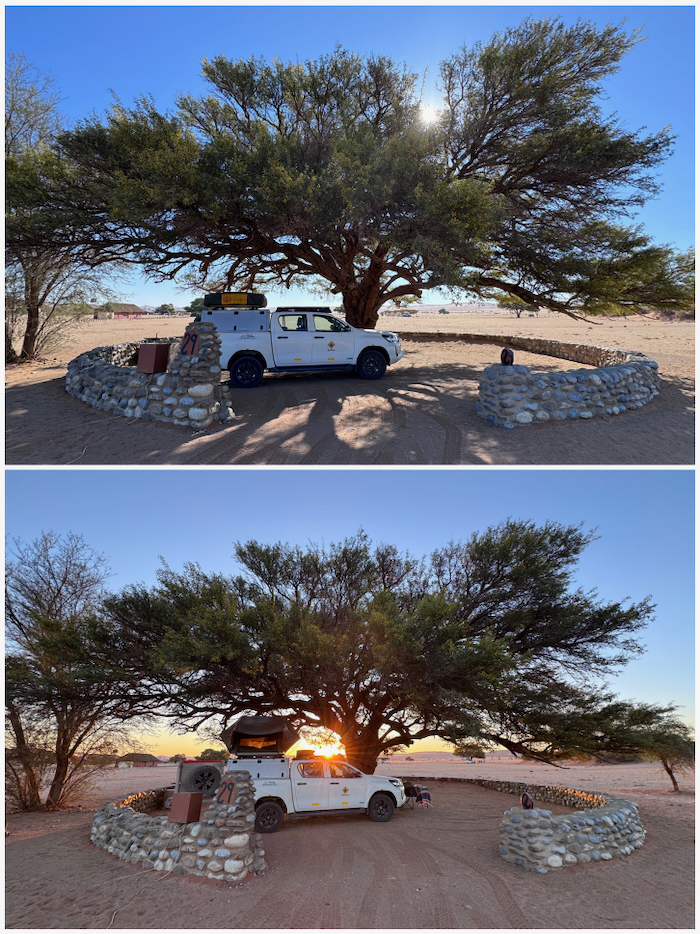 Unser Camp in Sesriem (Campsite NWR) liegt direkt vor den Toren des Nationalparks. Er hat 44 Stellplätze mit mal größeren, mal kleineren Kameldornbäumen, die von einer kleinen Mauer umgeben sind. Wir bekommen Stellplatz 29 und bleiben für drei Nächte. Es gibt Strom und fließend Wasser.