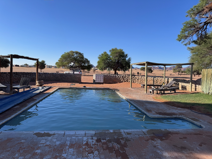Da wir von der laaaaangen Fahrt ohne Klimaanlage ordentlich durchgekocht sind, genießen wir die Abkühlung in Pool. Himmlisch!