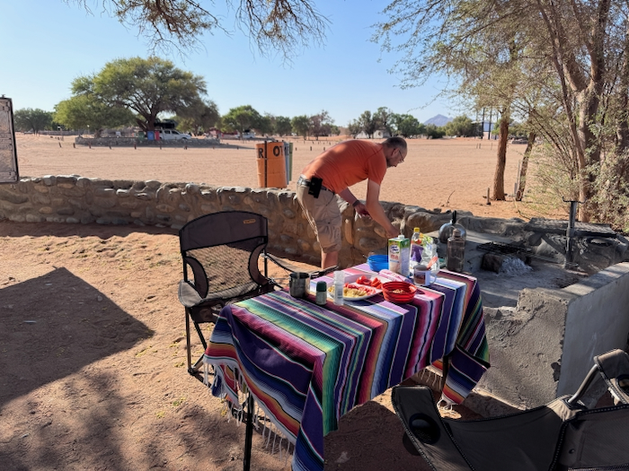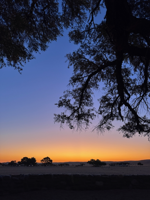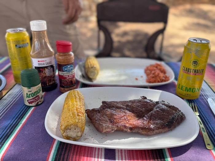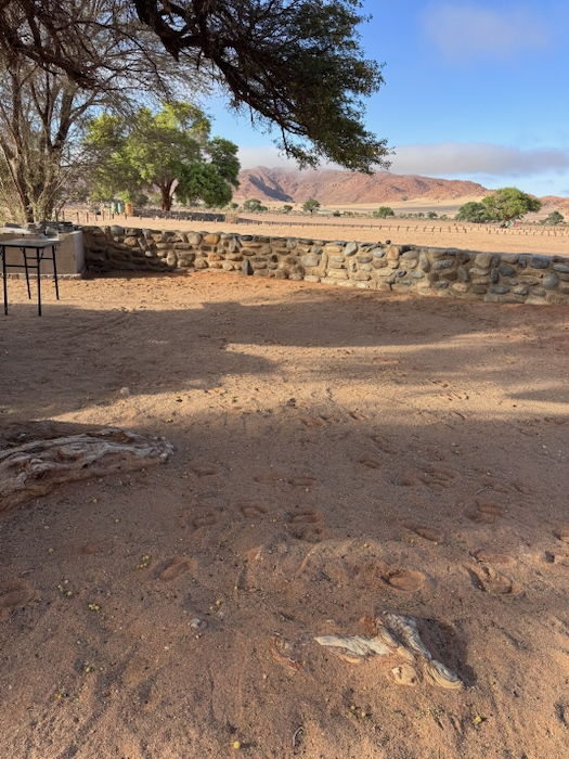 Nachts hatten wir scheinbar Besuch von Vierbeinern. Wir vermuten von Antilopen, evtl. Oryx oder Kudus und Hyänen.