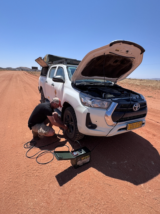 Sobald wir wieder auf Asphalt fahren, bekommt Spencer eine ordentliche Portion Luft aus seine Reifen. (Wenn man auf Schotter/ Sand fährt, muss man Luft ablassen, denn sonst läuft man schnell Gefahr sich die Reifen (und den Rücken) zu zerstören.) Den nötigen Kompressor haben wir mit dabei.