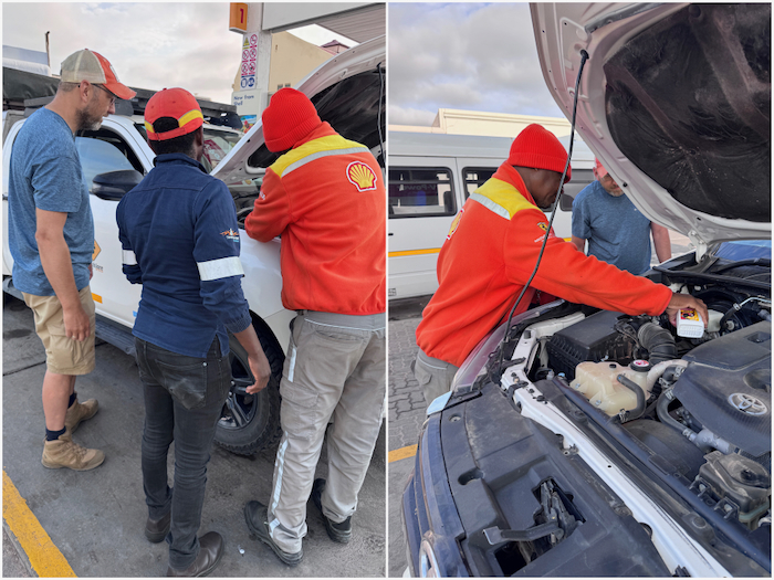 Gottseidank befinden wir uns in der Zivilisation und können ein paar Meter an einer Tankstelle um Hilfe fragen. Die haben Bremsflüssigkeit vorrätig und helfen uns schnell aus der Patsche.