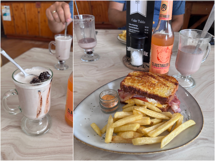 Wir könnten noch ewig weitere Gebäude entdecken, aber wir sind etwas erschöpft und hungrig und entscheiden uns hier im Restaurant einen Snack zu uns zu nehmen. Die Empfehlung unseres Guides war eine heiße Schokolade zu probieren. Machen wir, zusammen mit einem Sandwich.