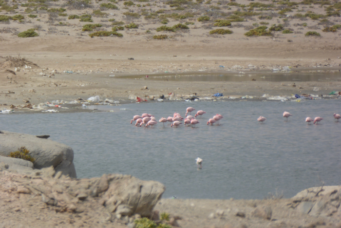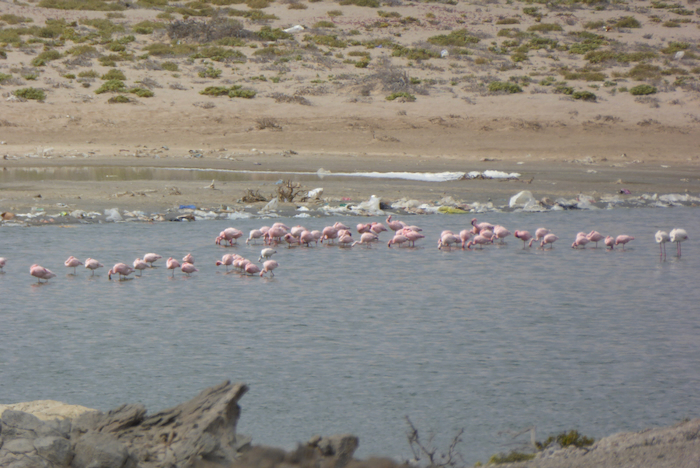 Auf dem Weg dort hin kommen wir an einem kleinen See vorbei, der auch im Sperrgebiet liegt. Hier tummeln sich Flamingos.