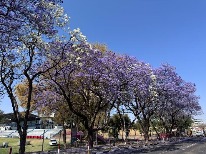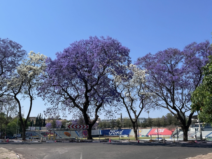 Vor dem Stadion stehen Bäume wie aus dem Märchen: Jacaranda
