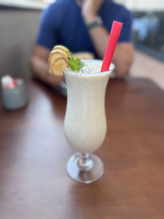 Wir trinken einen Kaffee und einen Mango/Bananenshake, denn umsonst ist die Aussicht von hier oben nicht. War sehr lecker.