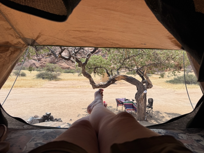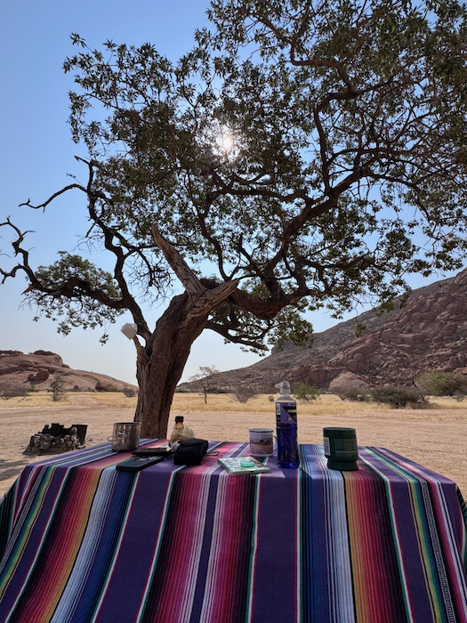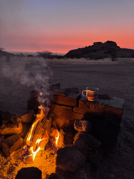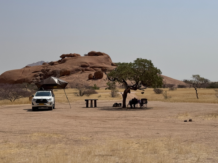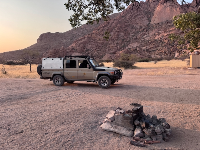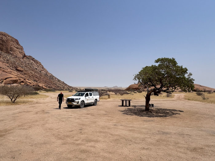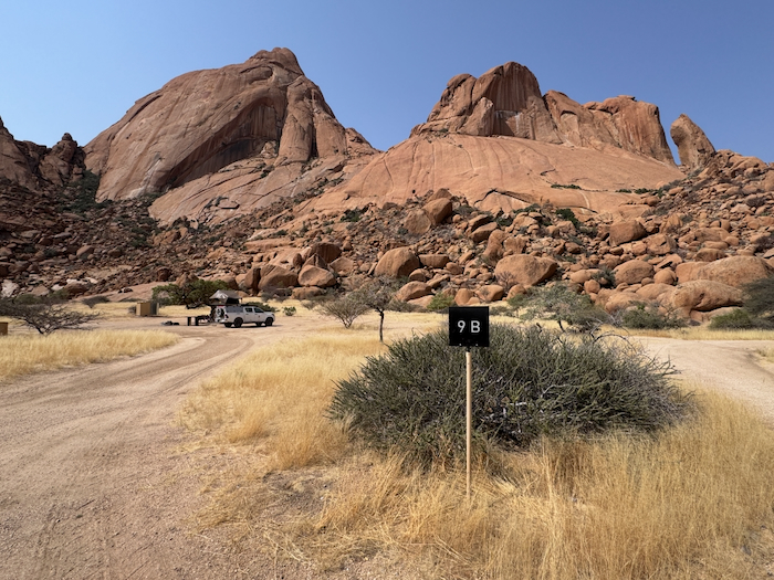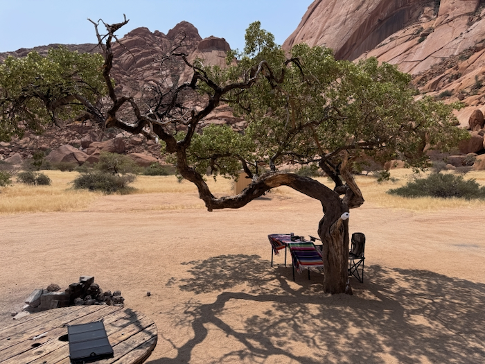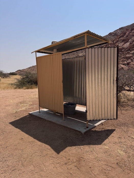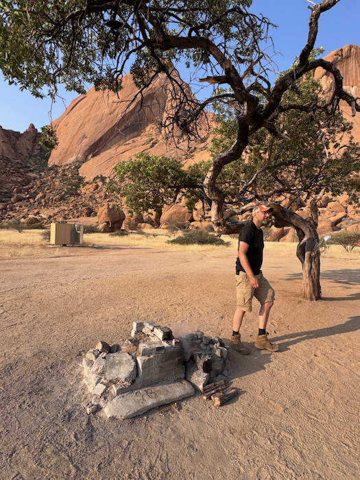 Jeder Platz hat eine Feuerstelle und ein Toilettenhäuschen und manchmal einen Schattenplatz in Form eines Baumes oder kleinen Unterstandes. kein fließendes Wasser, kein Strom, kein Internet. Ich stelle vor: 9b direkt an der großen Spitzkoppe: