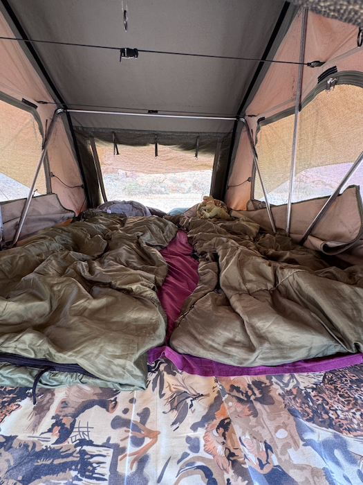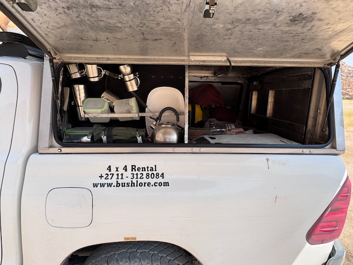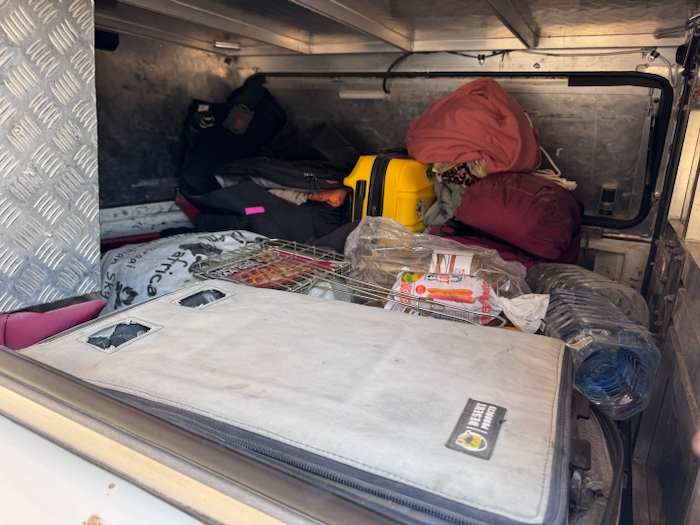 Dachzelt, Schlafsäcke + Kissen, Handtücher, Kühlschrank, Küchenkram, Tisch + Stühle, alle möglichen Utensilien, falls wir im Sand stecken bleiben und zwei Ersatzreifen.