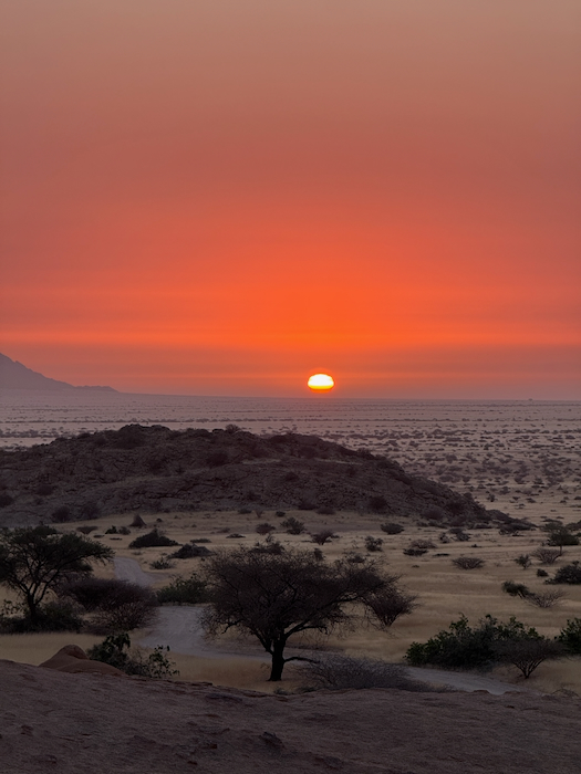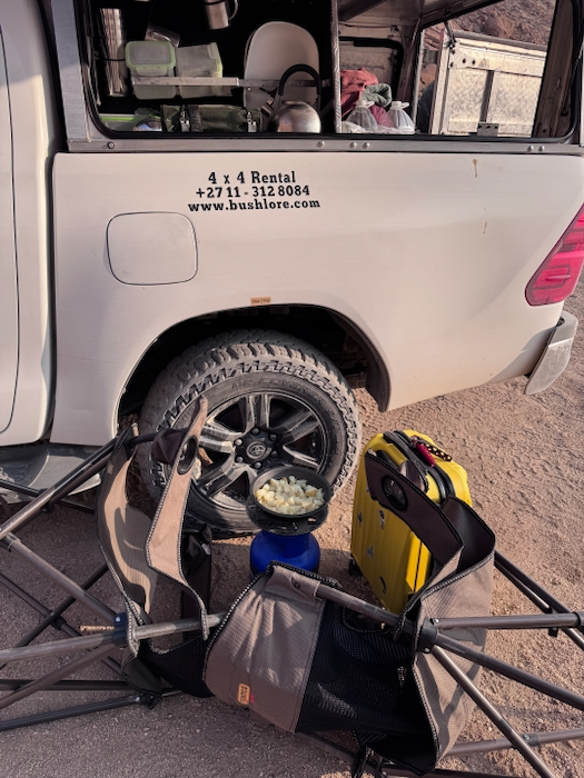 Sie haben das Logo am Fahrzeug gesehen und ein Fahrzeug auf einem Nachbarstellplatz repariert und wollten kurz fragen, wie es uns geht. Da Spencer ein Problem mit der Klimaanlage hat, sagte ich kurz: euch schickt der Himmel! Wir sind ja hier nun wirklich Mitten im Nichts! Kurz sprechen wir ab, dass es in Swakopmund eine Werkstatt gibt, zu der wir fahren können. Wir sollen uns einfach auf die beiden beziehen und dann wird uns geholfen. Aber das ist erst in ein paar Tagen.
