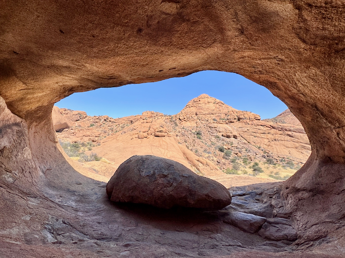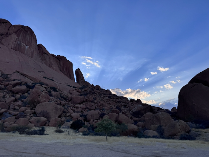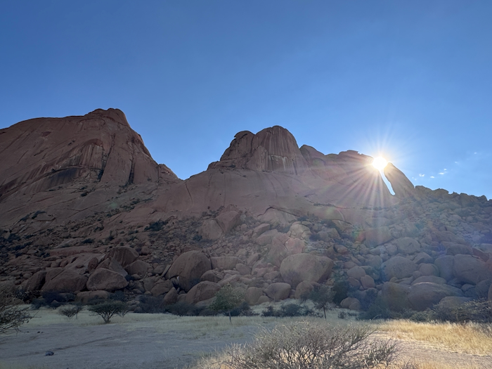 Um kurz nach 7 Uhr in der Früh scheint die Sonne direkt durch diese Spalte an der Spitzkoppe.