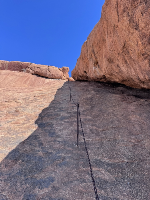 Dazu müssen wir ein ganzes Stück einen Fels an einer Kette hochklettern. Eigentlich nur mit Guide, aber der ist weit und breit nicht zu sehen. Also versuchen wir es selbst.