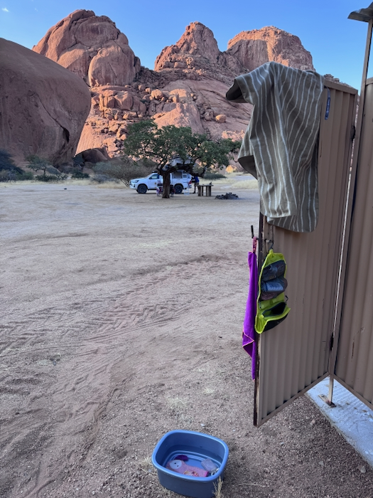 Da wir unseren Platz nicht aufgeben und bis zu den Duschen am Eingang des Platzes fahren wollen, improvisieren wir mit einer Waschgelegenheit an unserem Klohäuschen.