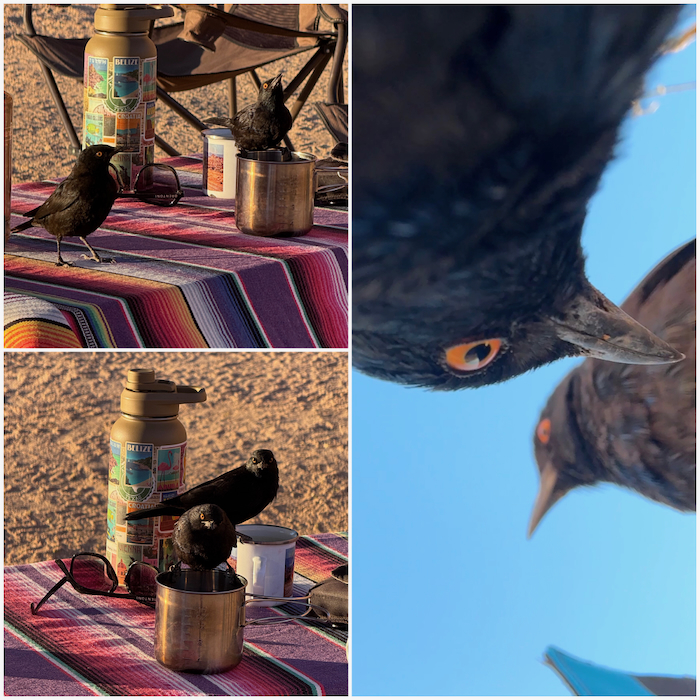 Den Nachmittag chillen wir. Zwei freundliche Stare freuen sich ein wenig Wasser aus unseren Tassen klauen zu können.